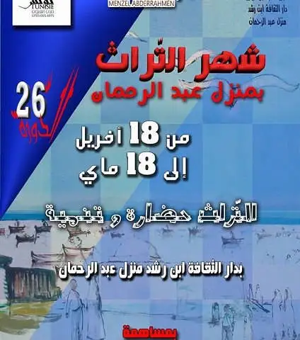 2 ماي 2017بمناسبة انعقاد شهر التراث في دورته الـ26 من 18 أفريل إلى 18 ماي 2017 تحت شعار “التراث حضارة وتنمية” تحتضن دار الثقافة بن رشد بمنزل عبد الرحمان الأحد 14 ماي 2017 بداية من الساعة العاشرة صباحا يوم التراث المحلي.
